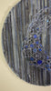 Die Unterlage wurde aus alten Jeans gefertigt, die in Streifen geschnitten und sorgfältig Schicht für Schicht aufgeklebt wurden. Dadurch entsteht eine lebendige, vertikale Struktur, die wie eine fließende Bewegung wirkt.